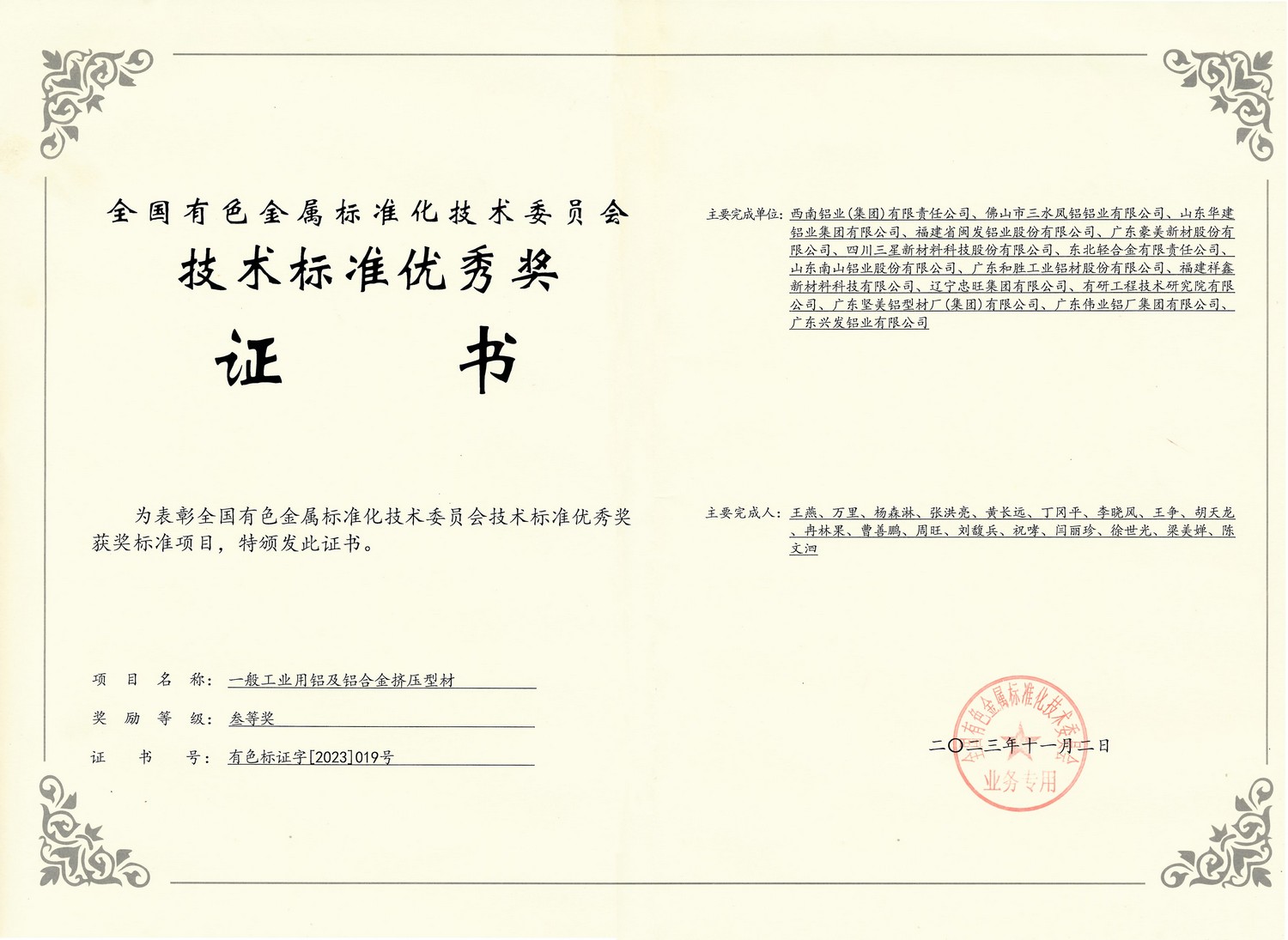 • 2023年11月2日 技術標準三等獎-GB一般工業用鋁及鋁合金擠壓型材(全國有色金屬標準化技術委員會)