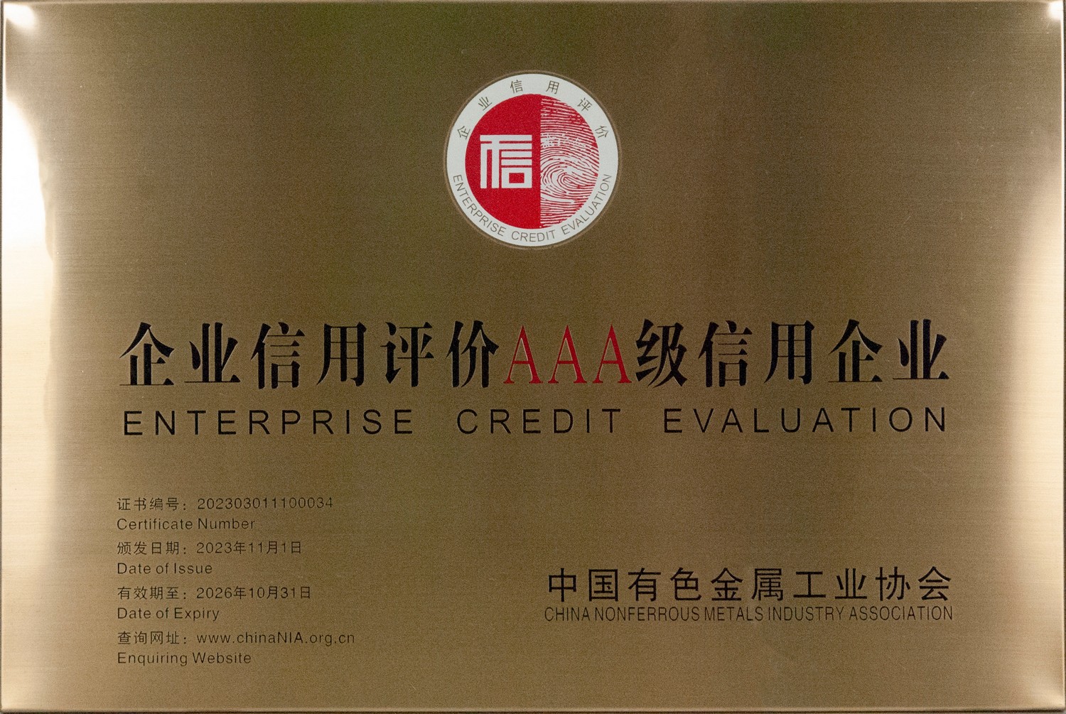 • 2023年11月1日 中國有色金屬工業協會 企業信用評價AAA級信用企業