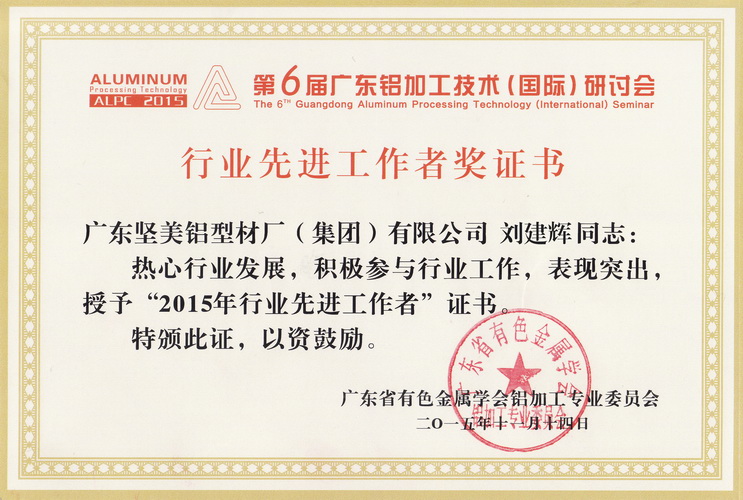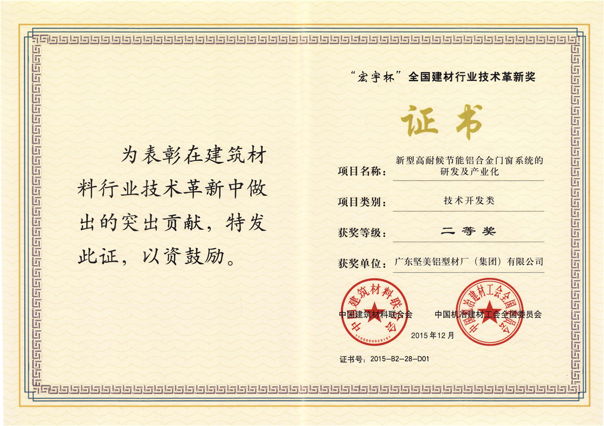 2016年1月 廣東省建材行業技術革新獎一等獎:新型高耐候節能鋁合金門窗系統的研發及產業化:于志龍 (廣東省建筑材料行業協會)