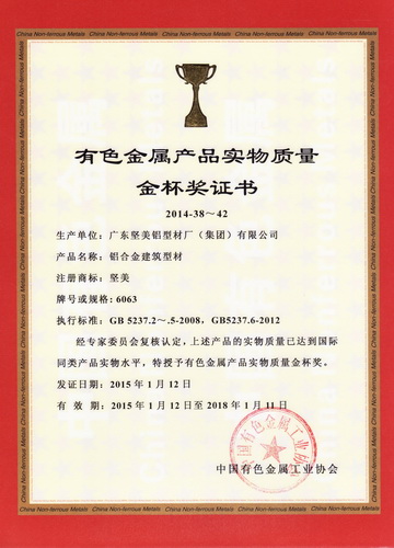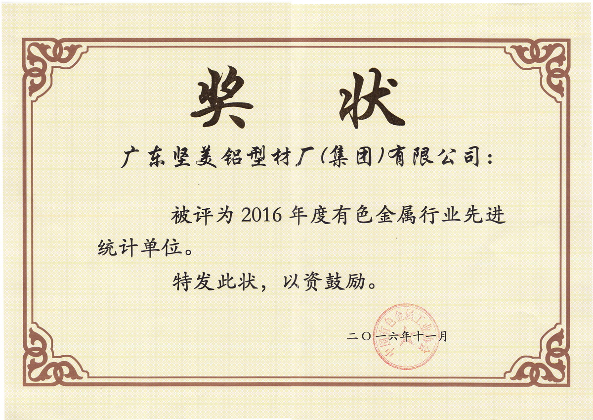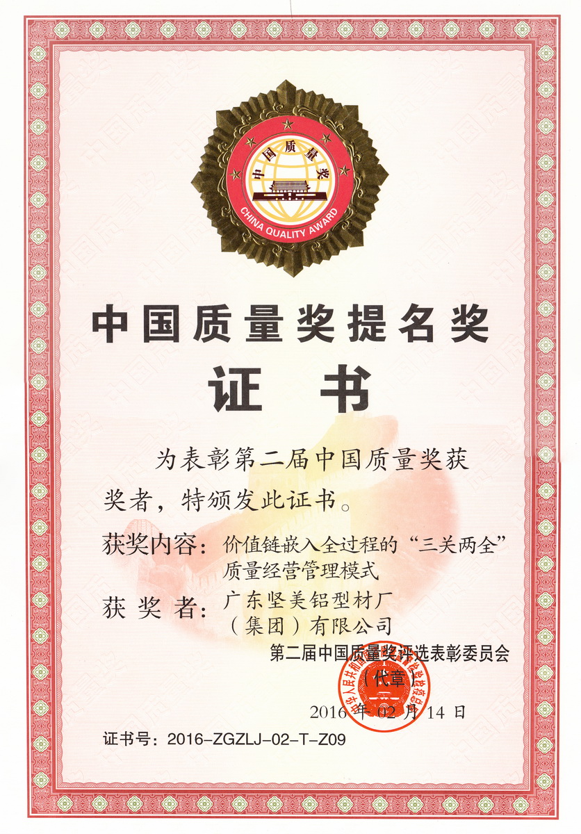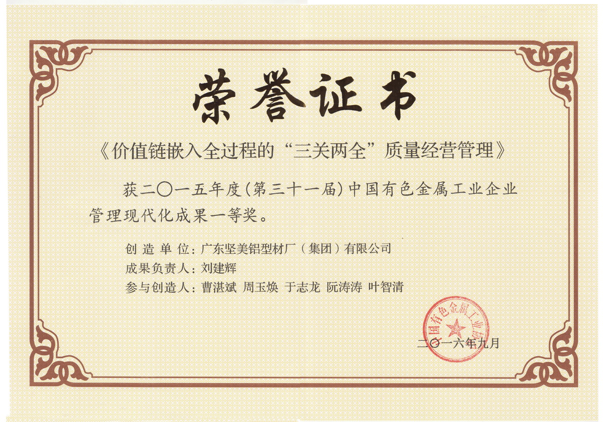2016年9月 2015年度中國有色金屬工業企業管理現代化成果一等獎:價值鏈嵌入全過程的“三關兩全”質量經營管理:廣東堅美(中國有色金屬工業協會)