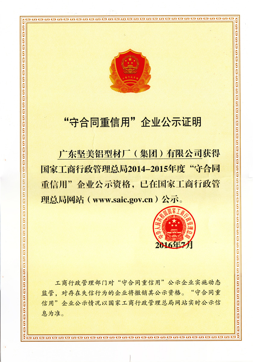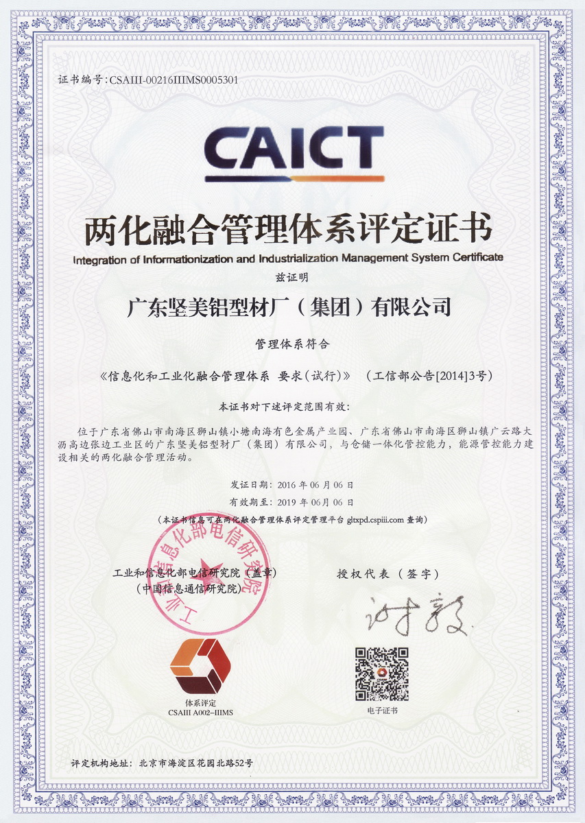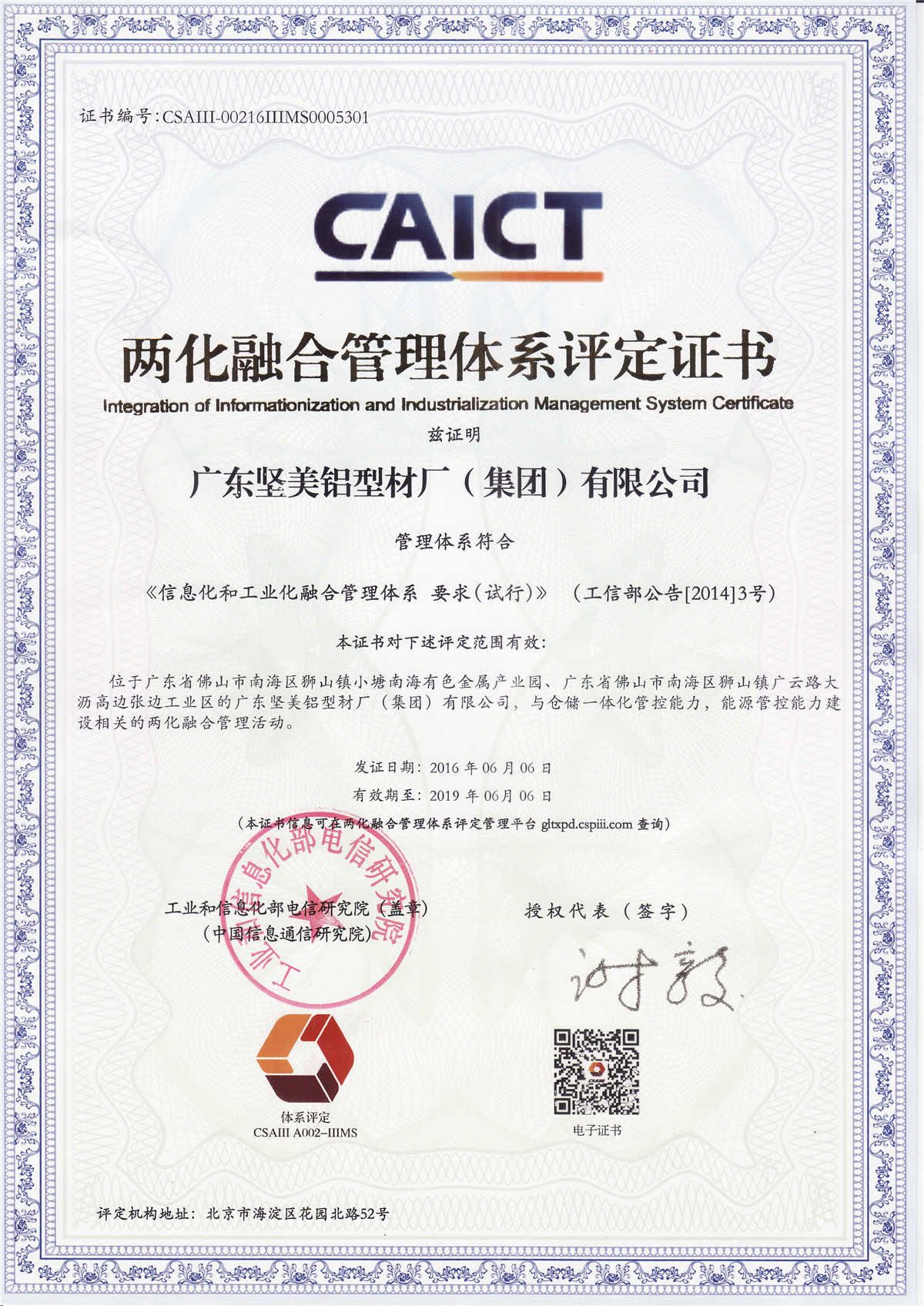 2016年9月 2015年度中國有色金屬工業企業管理現代化成果一等獎:價值鏈嵌入全過程的“三關兩全”質量經營管理:廣東堅美(中國有色金屬工業協會)