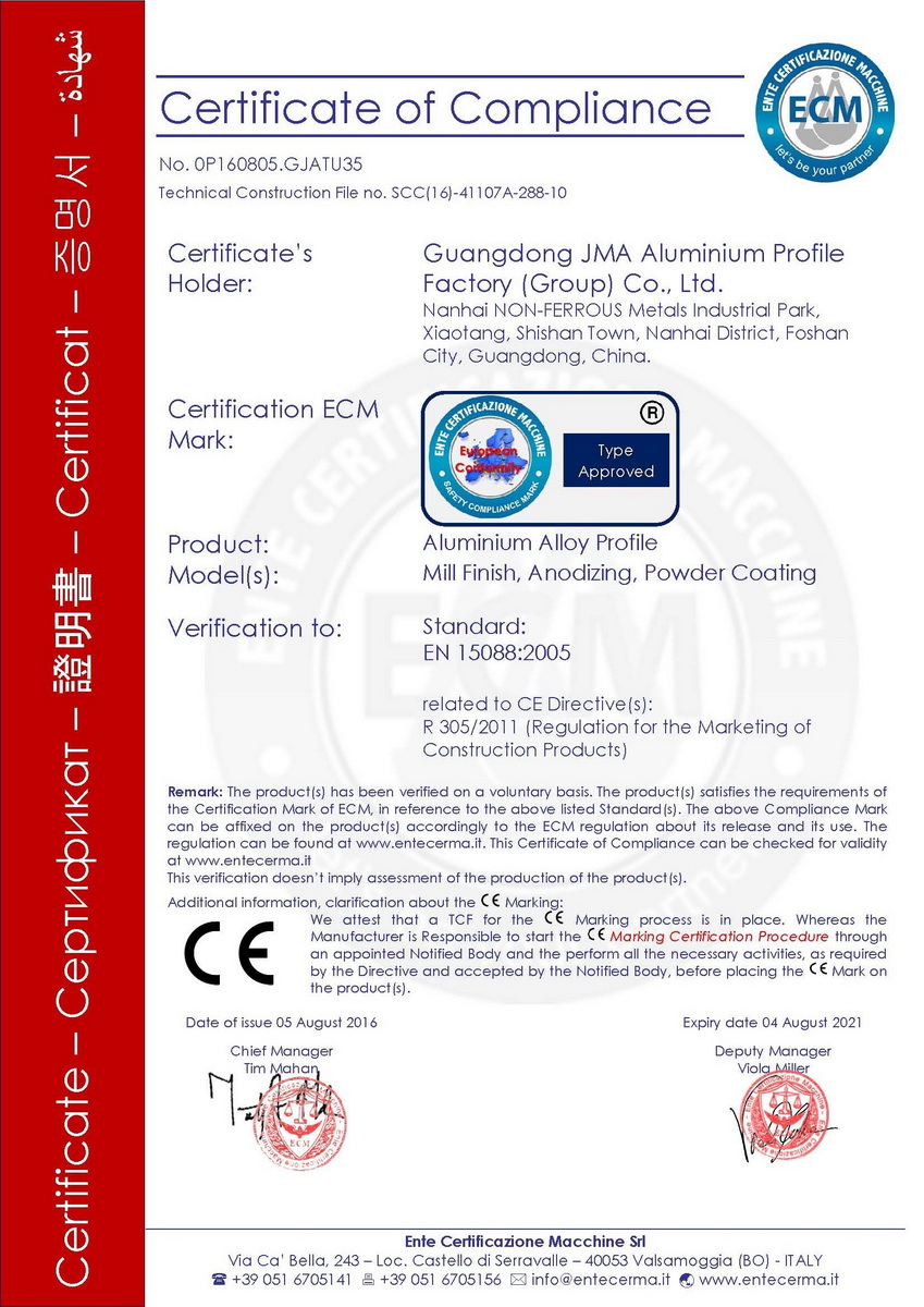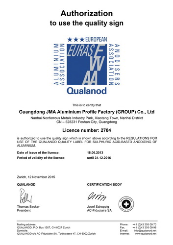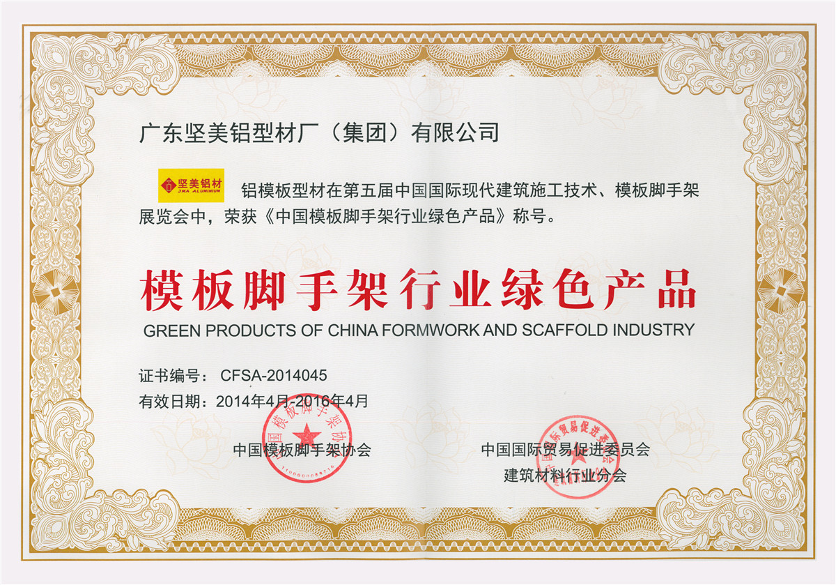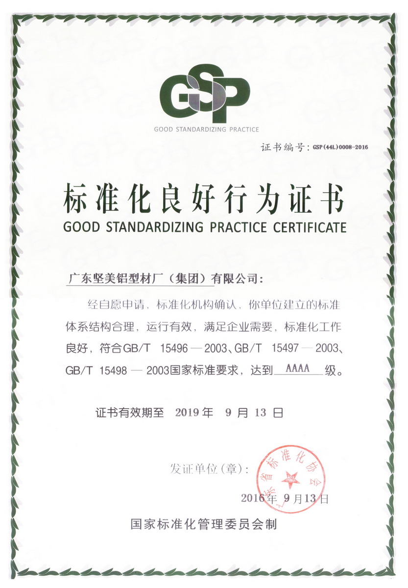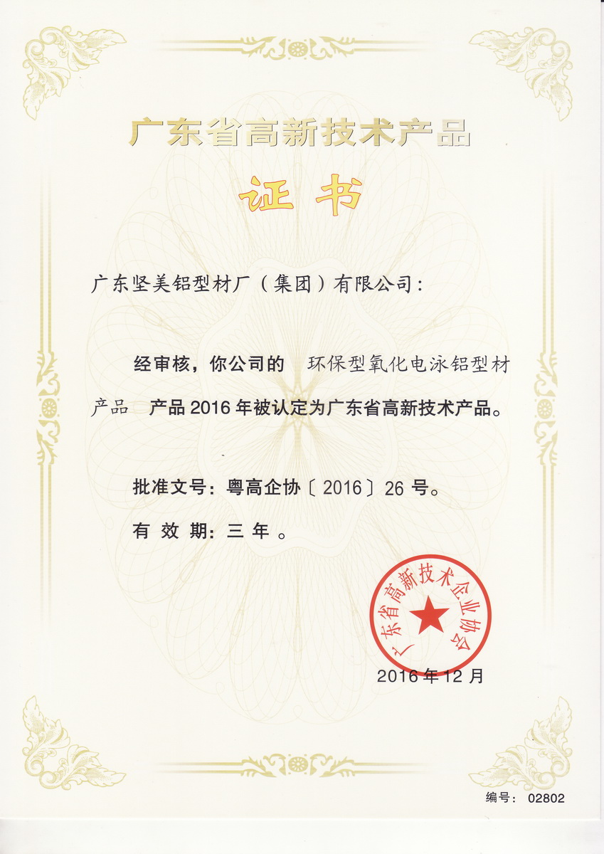 2016年12月 2016年度廣東省高新技術產品證書 :環保型氧化電泳鋁型材產品(廣東省高新技術企業協會)