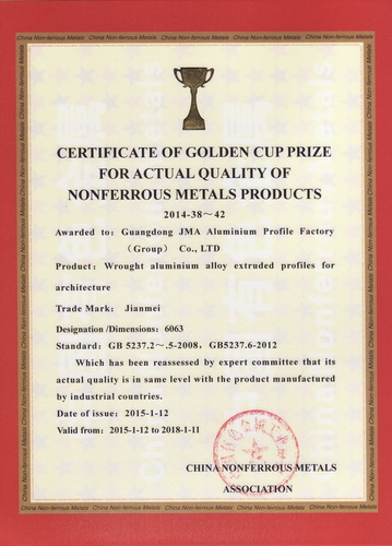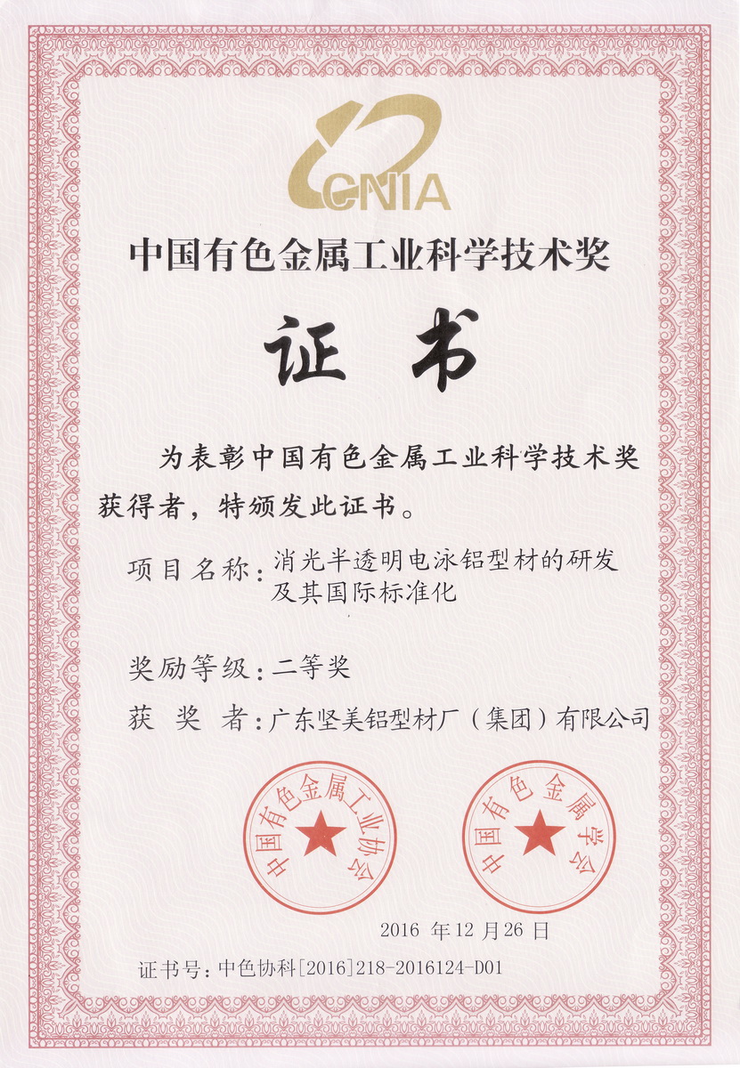 2016年12月 2016年度中國有色金屬工業科學技術獎二等獎:消光半透明電泳鋁型材的研發及其國際標準化(中國有色金屬工業協會)