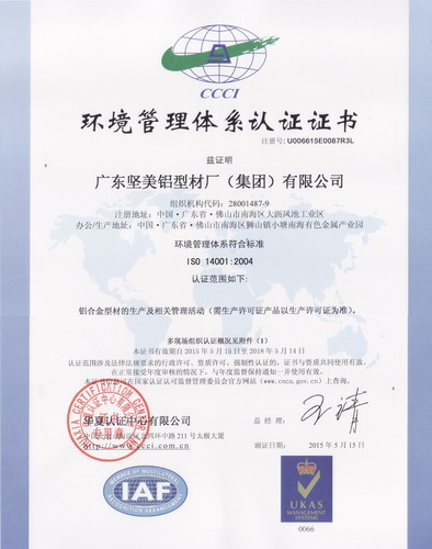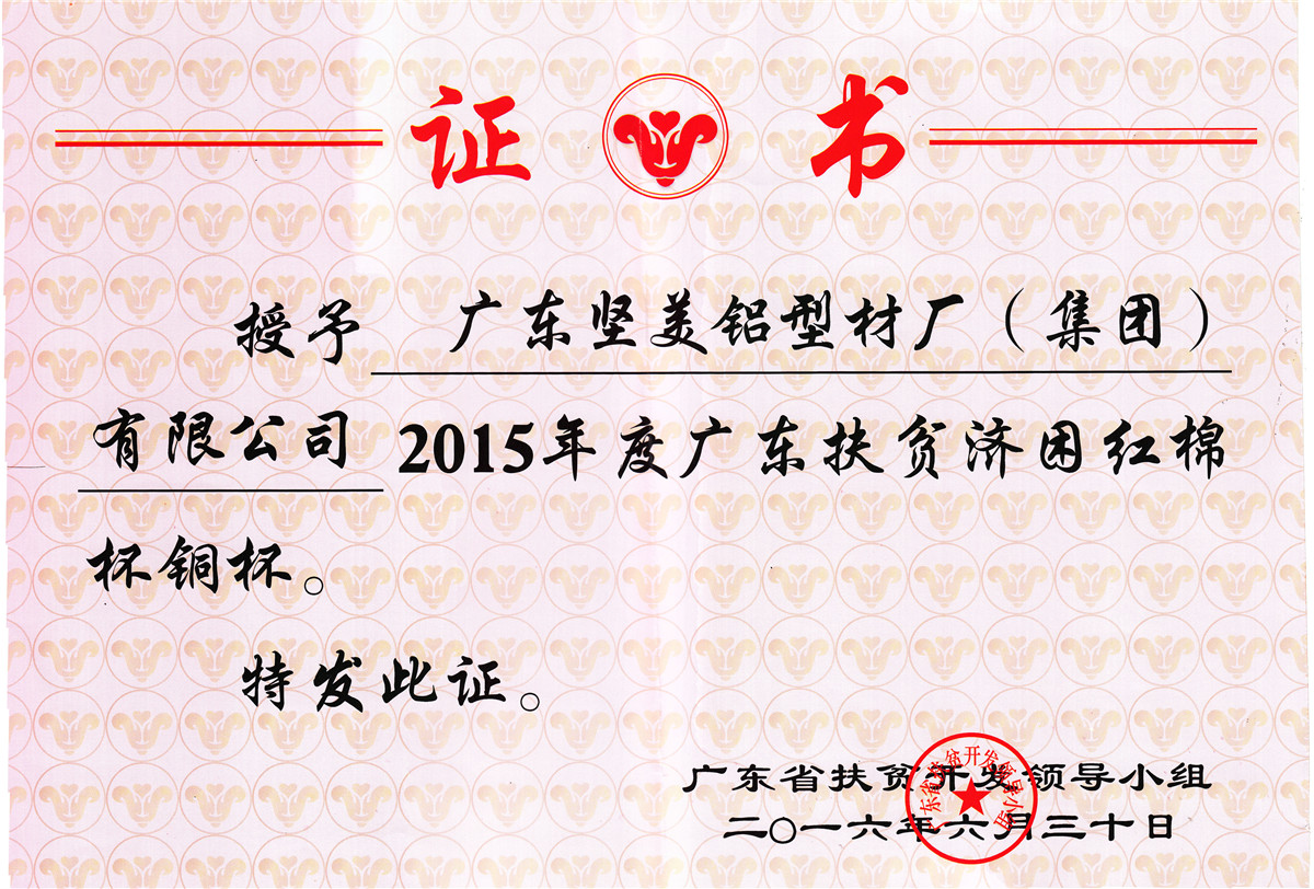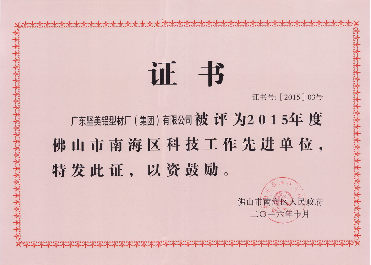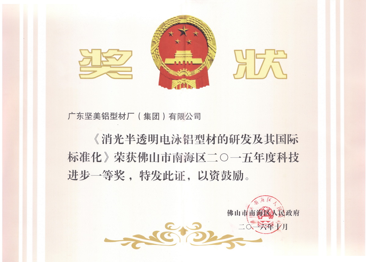 2016年10月 2015年度南海區科技進步獎一等獎 消光半透明電泳鋁型材的研發及其國際標準化:廣東堅美