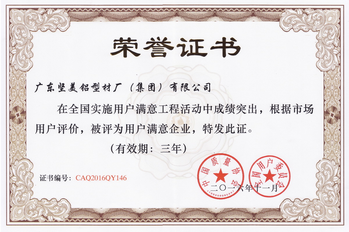 2016年 11月 用戶滿意企業:廣東堅美(中國質量協會)