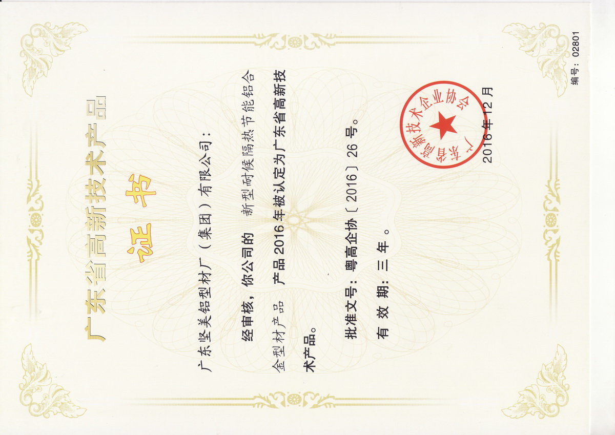 2016年12月 2016年度廣東省高新技術產品證書 :新型耐候隔熱節能鋁合金型材產品(廣東省高新技術企業協會)