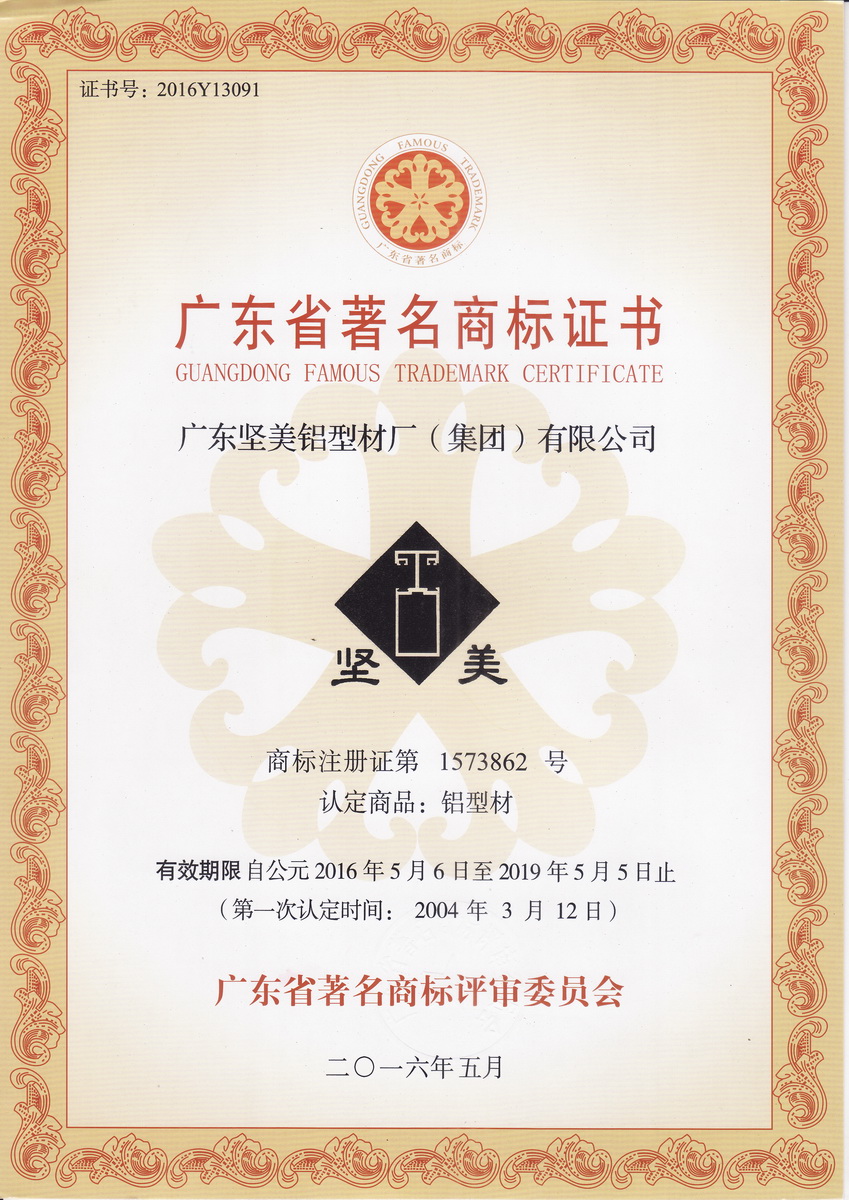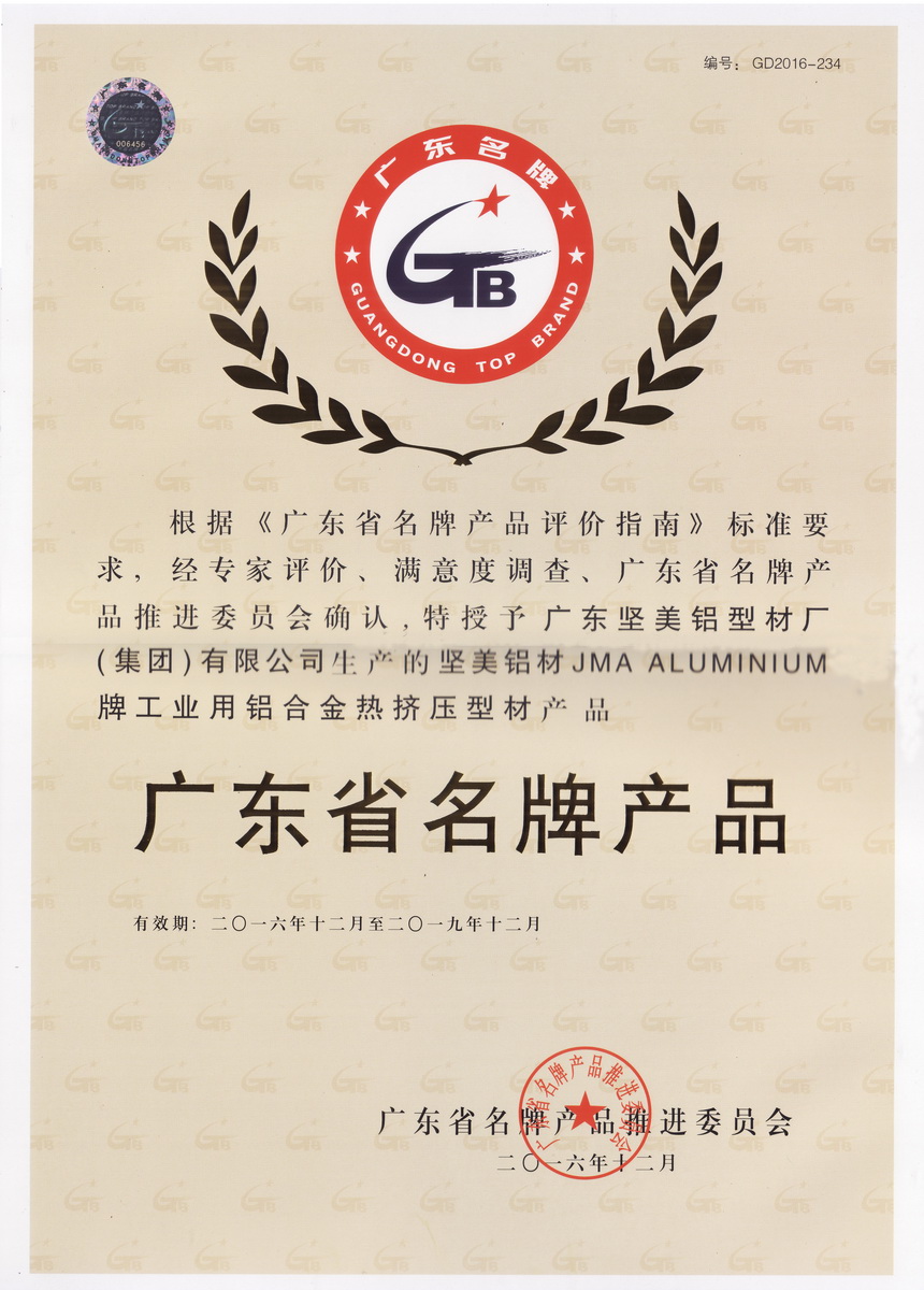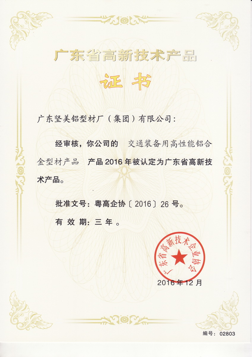 2016年12月 2016年度廣東省高新技術產品證書 :交通裝備用高性能鋁合金型材產品(廣東省高新技術企業協會)