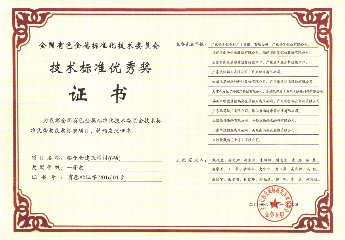 2016.11 全國有色金屬技術標準優秀獎(鋁合金建筑型材6項 一等獎)