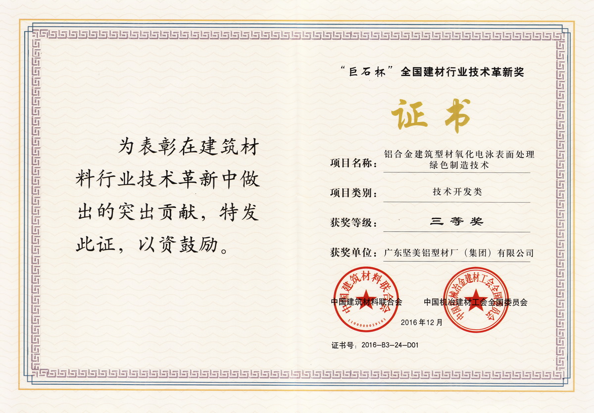 2016年12月 2016年度“巨石杯”全國建材行業技術革新獎三等獎-鋁合金建筑型材氧化電泳表面處理綠色制造技術:廣東堅美公司證書