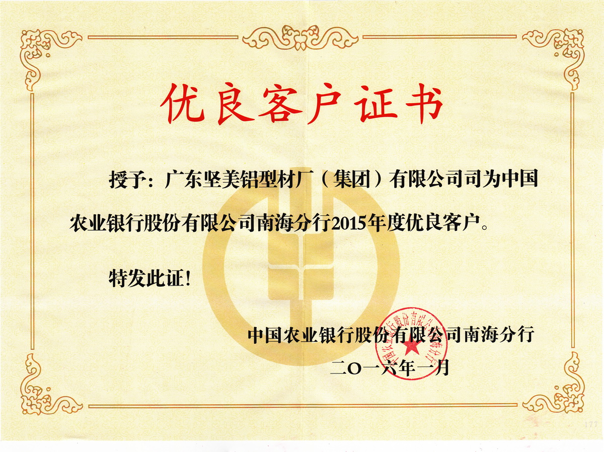2016年1月 2015年度優良客戶證書:廣東堅美 (中國農業銀行南海分行)