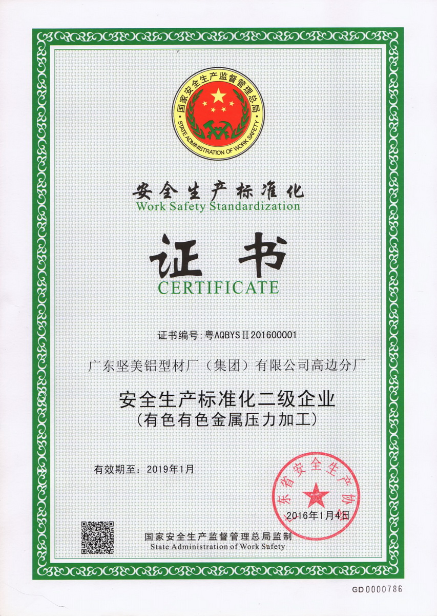 2016年1月 安全生產標準化二級企業2(有色金屬壓力加工):廣東堅美 (廣東省安全生產協會)