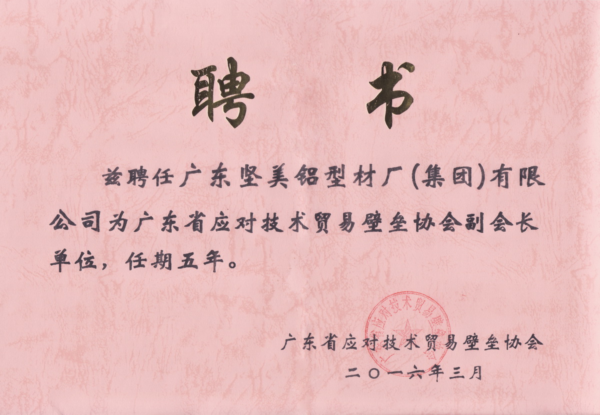 2016年3月 廣東省應對技術貿易壁壘副會長單位:廣東堅美 (廣東省應對技術貿易壁壘協會)