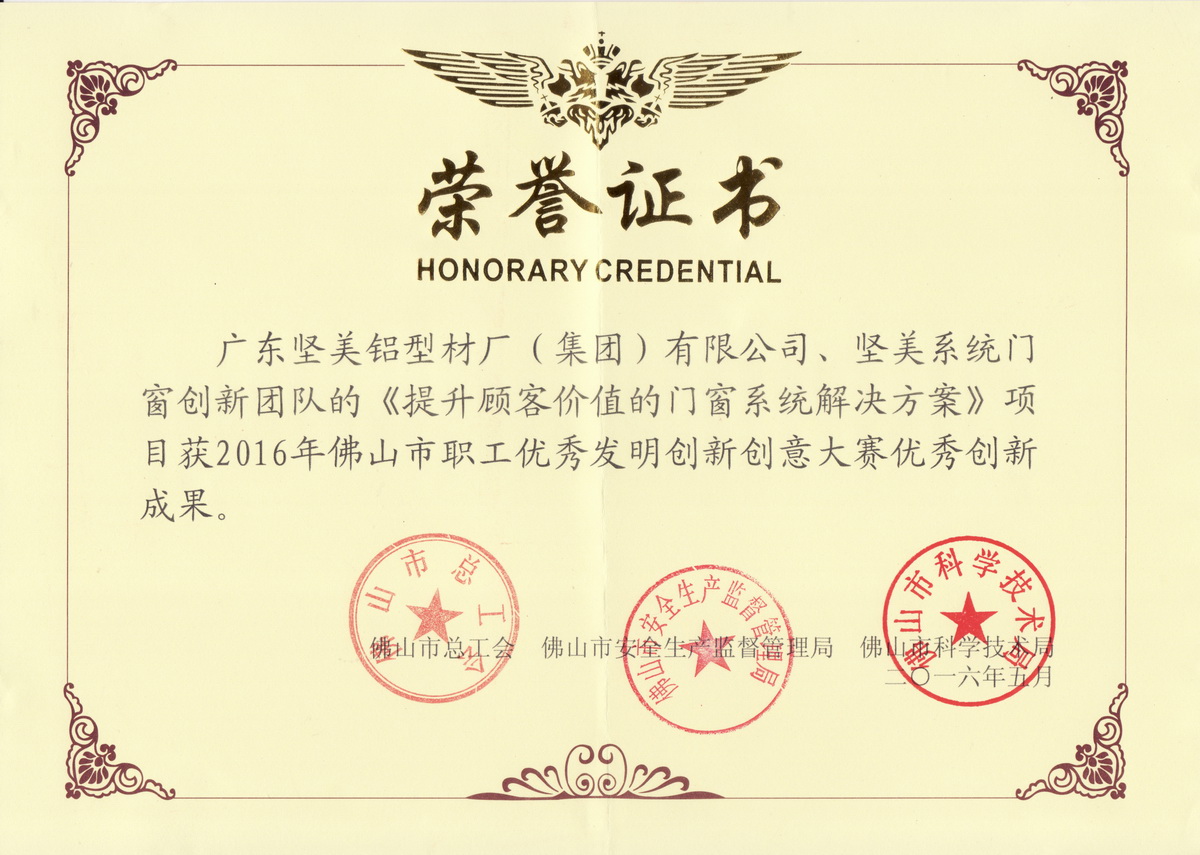 2016年5月 佛山市職工優秀發明創新創意大賽優秀創新成果:提升顧客價值的門窗系統解決方案:廣東堅美 (佛山市科學技術局)