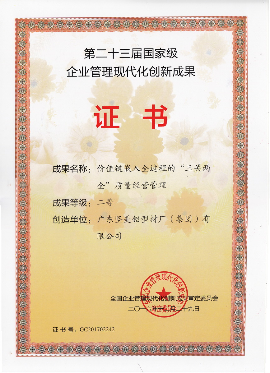 2016年12月 第二十三屆國家級企業管理現代化創新成果 二等獎:價值鏈嵌入全過程的“三關兩全”質量經營管理:廣東堅美