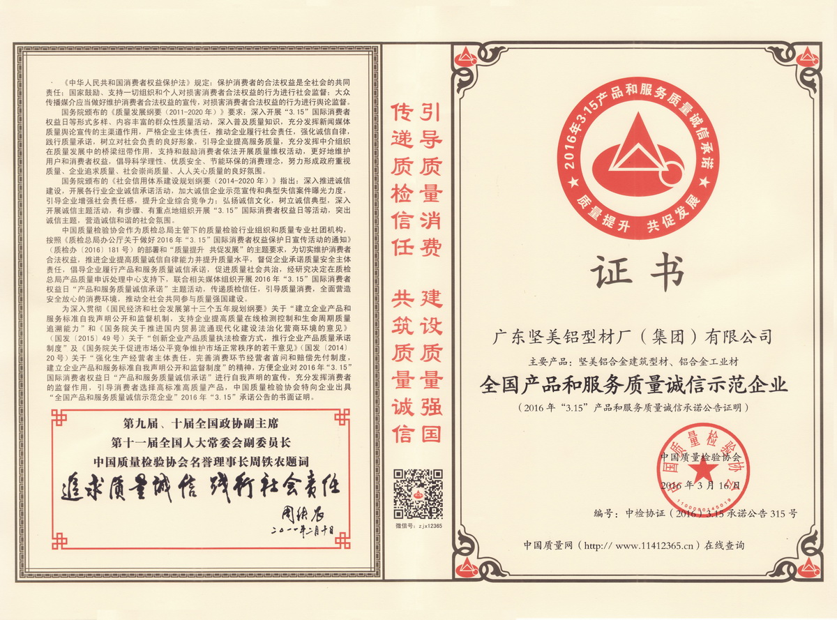 2016年3月 全國產品和服務質量誠信示范企業:廣東堅美 (中國質量檢驗協會)