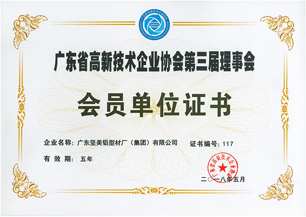 廣東省高新技術企業協會第三屆理事會會員單位證書
