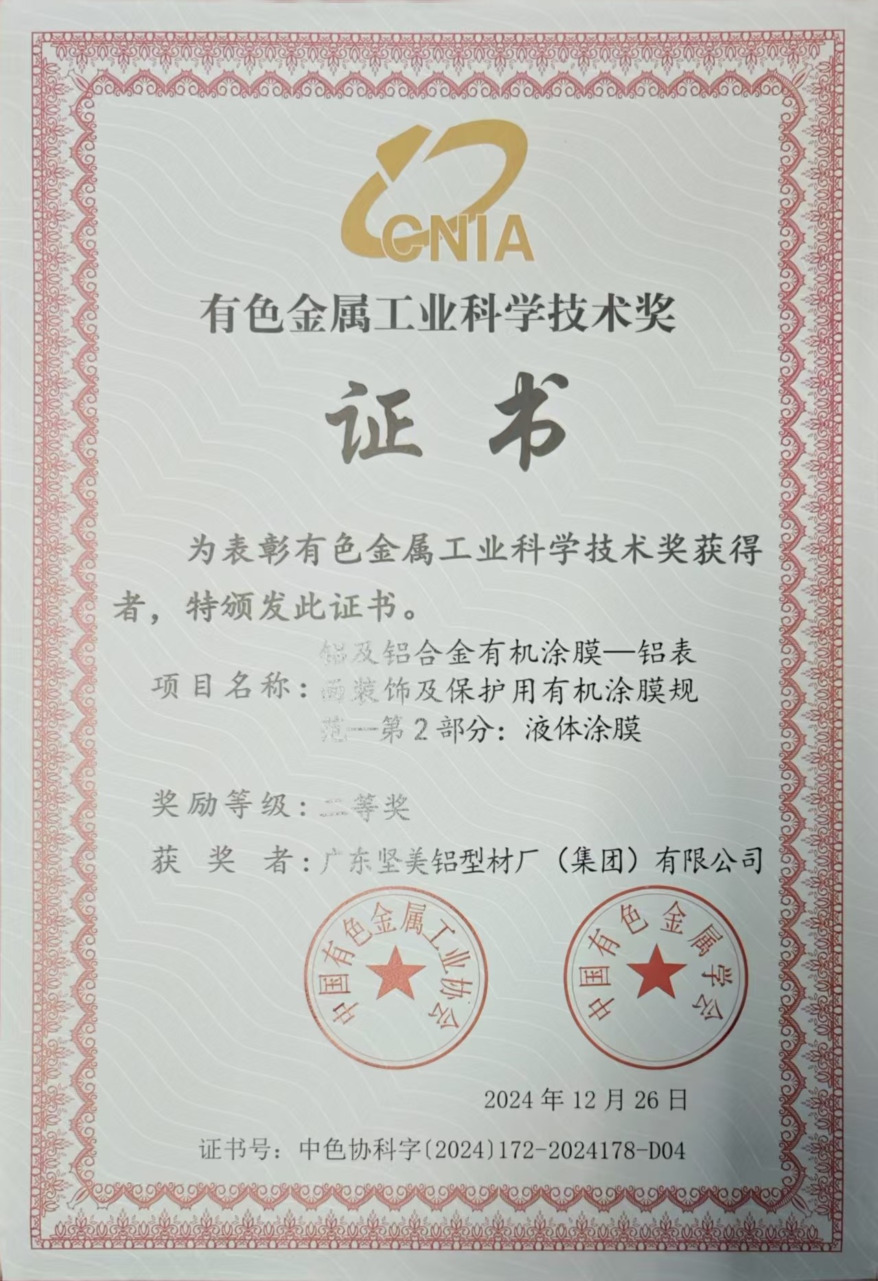 • 2025年3月 中國有色金屬工業科學技術獎二等獎(鋁及鋁合金有機涂膜 標準)