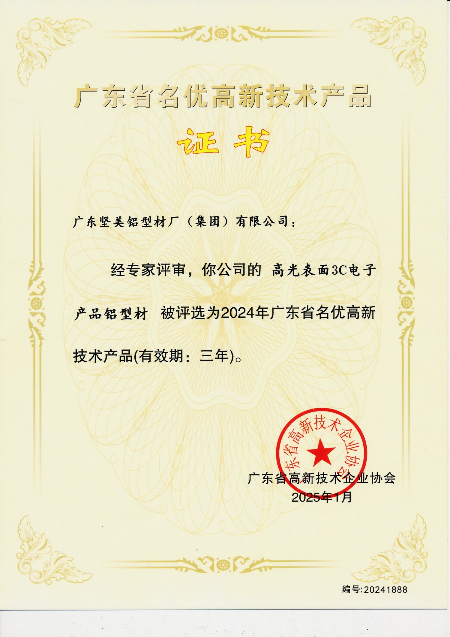 • 2025年1月 2024年廣東省名優高新技術產品:高光表面3C電子產品鋁型材