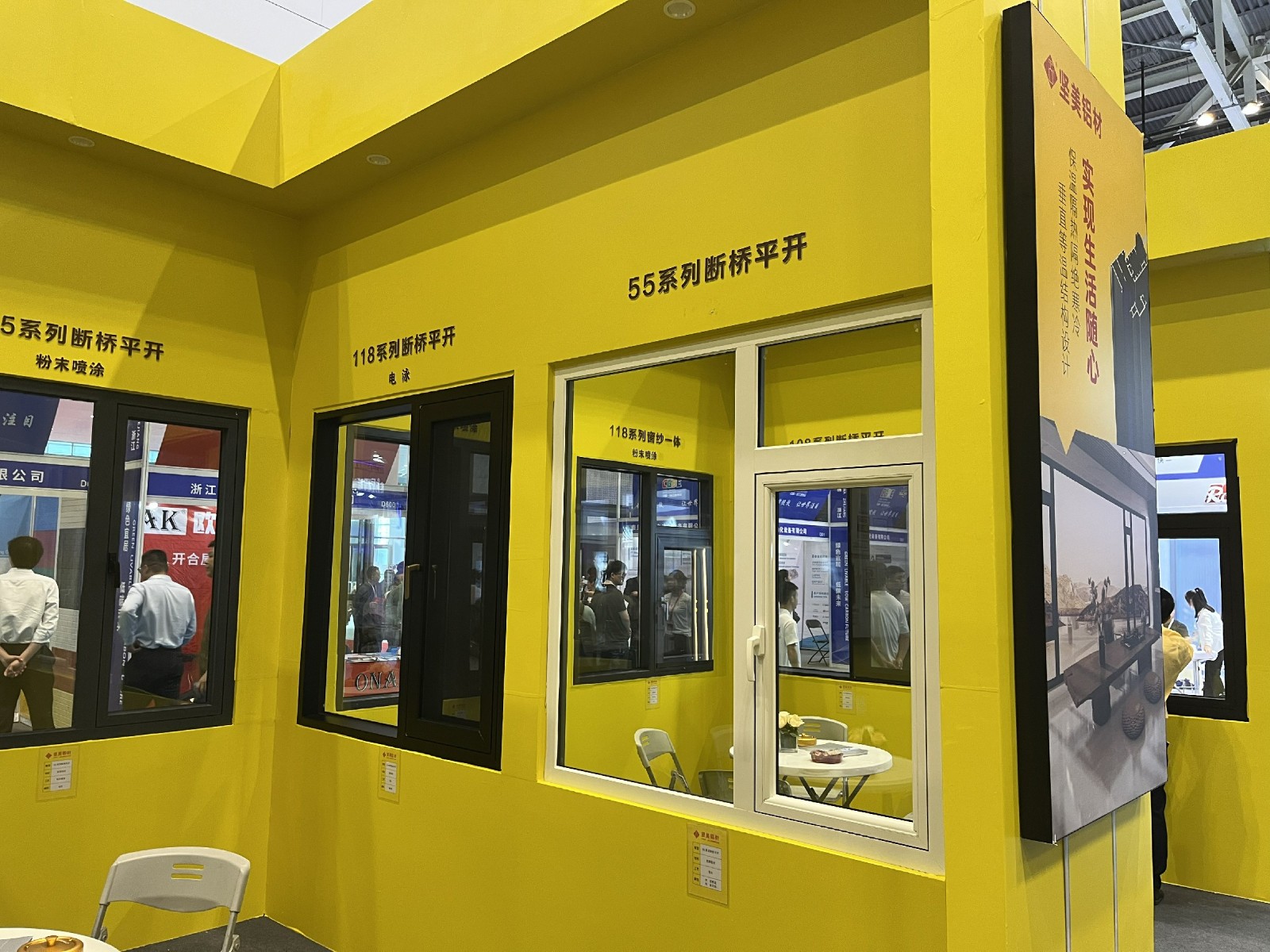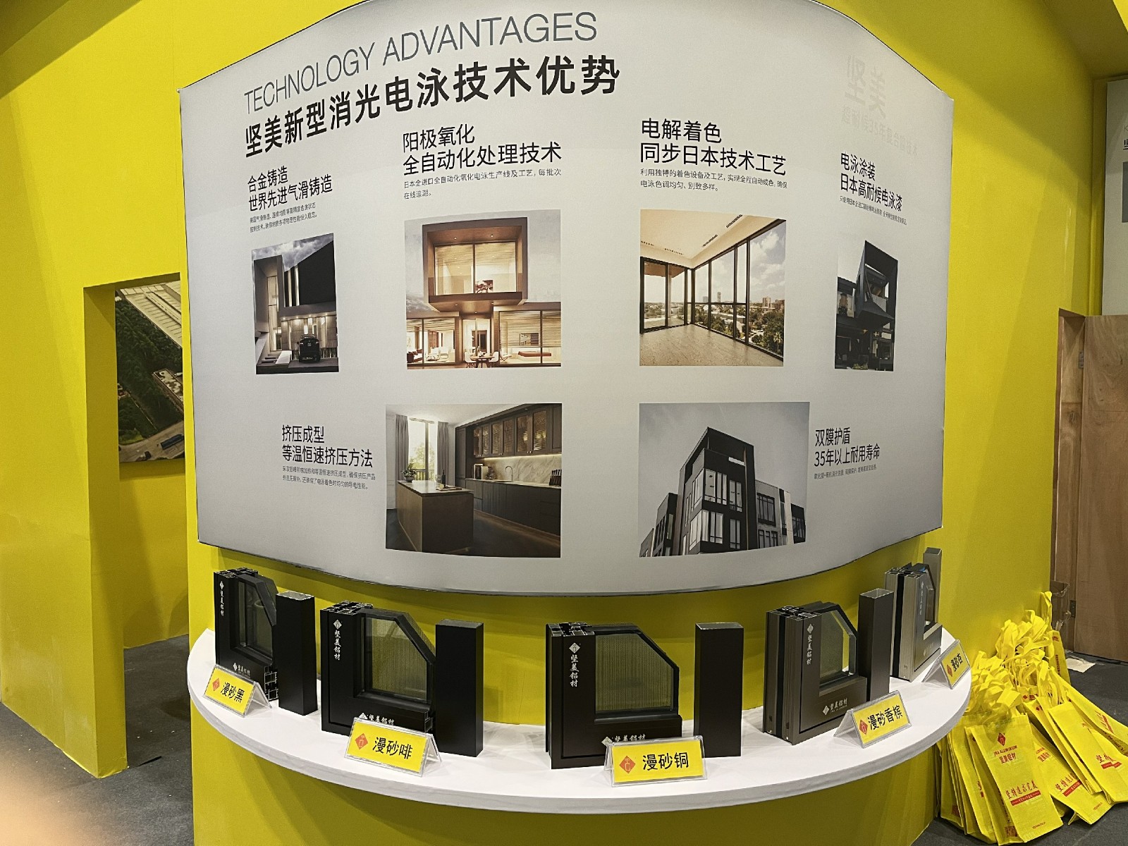 展出的穿條平開系列,以其簡約的設(shè)計(jì)、環(huán)保材料的低碳節(jié)能,在隔音、隔熱等方面的出色表現(xiàn),引來不少客商圍觀咨詢。以高顏值以及優(yōu)秀耐蝕性、耐候性能為主打的堅(jiān)美新型消光電泳產(chǎn)品展示區(qū),同樣吸引了眾多客商爭相了解。通過實(shí)物接觸及現(xiàn)場觀摩,客商們可以看到堅(jiān)美新型消光電泳鋁材呈現(xiàn)出特殊的亞光色調(diào)、又不失金屬光澤質(zhì)感,涂層均勻、光滑,觸摸手感細(xì)膩柔和,產(chǎn)品外觀極具質(zhì)感,不少客商紛紛豎起大拇指,點(diǎn)贊堅(jiān)美品質(zhì)!